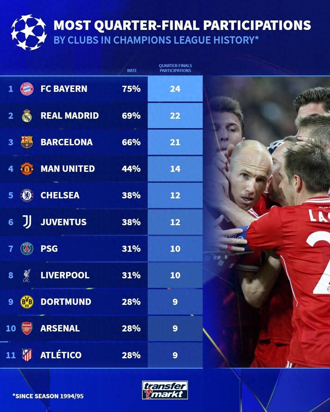 欧冠1/4决赛参赛次数:皇萨仁遥遥领先 曼联第4 阿森纳并列第9